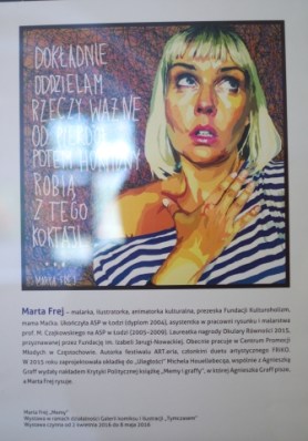 Ponad 60 memów Marty Frej będzie można obejrzeć na wystawie zorganizowanej w Centrum Kultury Zamek we Wrocławiu. Artystka posługuje się jednym z najciekawszych tworów popkultury – memami. Za pomocą memów opatrzonych jej rysunkami uprawia nowoczesną formę felietonu z aktualnymi komentarzami do rzeczywistości- czasem śmiesznymi, czasem gorzkimi- zawsze trafnymi. Liczba lajków na jej profilu „Marta Frej –postać fikcyjna” osiągnęła już prawie 90 tysięcy, a Marta stała się głosem kobiet.